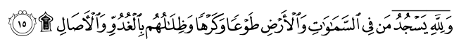 وَلِلَّهِ یَسْجُدُ مَن فِی السَّمَاوَاتِ وَالْأَرْضِ طَوْعًا وَکَرْهًا وَظِلَالُهُم بِالْغُدُوِّ وَالْآصَالِ