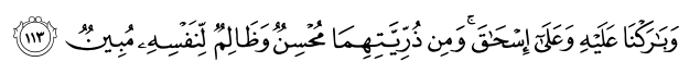 وَبَارَکْنَا عَلَیْهِ وَعَلَى إِسْحَاقَ وَمِن ذُرِّیَّتِهِمَا مُحْسِنٌ وَظَالِمٌ لِّنَفْسِهِ مُبِینٌ