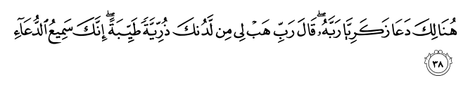 هُنَالِکَ دَعَا زَکَرِیَّا رَبَّهُ قَالَ رَبِّ هَبْ لِی مِن لَّدُنکَ ذُرِّیَّةً طَیِّبَةً إِنَّکَ سَمِیعُ الدُّعَاءِ