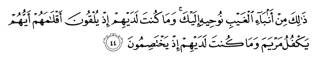 ذَلِکَ مِنْ أَنبَاءِ الْغَیْبِ نُوحِیهِ إِلَیْکَ وَمَا کُنتَ لَدَیْهِمْ إِذْ یُلْقُونَ أَقْلَامَهُمْ أَیُّهُمْ یَکْفُلُ مَرْیَمَ وَمَا کُنتَ لَدَیْهِمْ إِذْ یَخْتَصِمُونَ