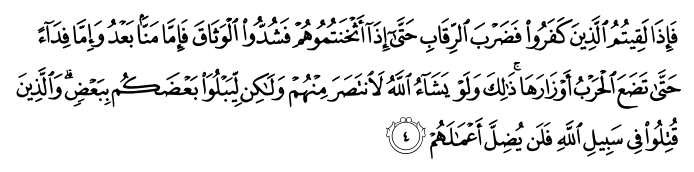 فَإِذَا لَقِیتُمُ الَّذِینَ کَفَرُوا فَضَرْبَ الرِّقَابِ حَتَّى إِذَا أَثْخَنتُمُوهُمْ فَشُدُّوا الْوَثَاقَ فَإِمَّا مَنًّا بَعْدُ وَإِمَّا فِدَاءً حَتَّى تَضَعَ الْحَرْبُ أَوْزَارَهَا ذَلِکَ وَلَوْ یَشَاءُ اللَّهُ لَانتَصَرَ مِنْهُمْ وَلَکِن لِّیَبْلُوَ بَعْضَکُم بِبَعْضٍ وَالَّذِینَ قُتِلُوا فِی سَبِیلِ اللَّهِ فَلَن یُضِلَّ أَعْمَالَهُمْ