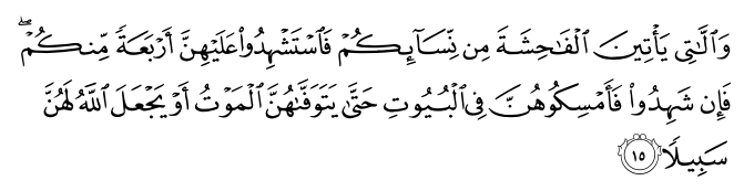 وَاللَّاتِی یَأْتِینَ الْفَاحِشَةَ مِن نِّسَائِکُمْ فَاسْتَشْهِدُوا عَلَیْهِنَّ أَرْبَعَةً مِّنکُمْ فَإِن شَهِدُوا فَأَمْسِکُوهُنَّ فِی الْبُیُوتِ حَتَّى یَتَوَفَّاهُنَّ الْمَوْتُ أَوْ یَجْعَلَ اللَّهُ لَهُنَّ سَبِیلًا