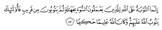 إِنَّمَا التَّوْبَةُ عَلَى اللَّهِ لِلَّذِینَ یَعْمَلُونَ السُّوءَ بِجَهَالَةٍ ثُمَّ یَتُوبُونَ مِن قَرِیبٍ فَأُولَئِکَ یَتُوبُ اللَّهُ عَلَیْهِمْ وَکَانَ اللَّهُ عَلِیمًا حَکِیمًا